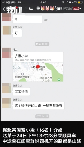 小李還于24日16時左右于永嘉上塘派出所報案,其間警方通過趙某朋友的手機(jī)與滴滴平臺溝通要求獲得司機(jī)具體信息(電話、車牌等),但無果。上塘派出所民警證實,昨天派出所內(nèi)有民警參與處理該起事件。