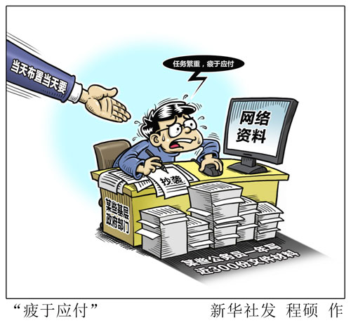 湖北省某縣委政研室干部說,一些黨員干部特別是領(lǐng)導(dǎo)干部能力不濟,把發(fā)文、開會當(dāng)作抓落實的主要方式方法,甚至將其做成履職盡責(zé)、推卸責(zé)任的“痕跡”,一些文件層層轉(zhuǎn)發(fā)、照抄照轉(zhuǎn),很多時候并無新的實質(zhì)性內(nèi)容,完全是重復(fù)上級精神,造成基層干部有看不完的文件、開不完的會。