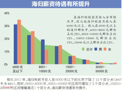 22日,某招聘網(wǎng)站與某智庫機構(gòu)聯(lián)合發(fā)布了《2018中國海歸就業(yè)創(chuàng)業(yè)調(diào)查報告》,重點反映了以“90后”為主的新生代海歸群體在留學(xué)前后的發(fā)展變化。與去年相比,今年調(diào)查的海歸就業(yè)競爭力及薪酬均有提升,近七成海歸稅前月收入在6000元以上,月收入在10001~20000元區(qū)間的增幅達(dá)7個百分點。