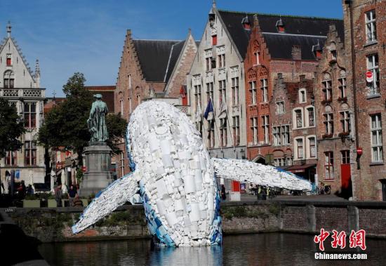 資料圖:當?shù)貢r間7月2日,來自紐約布魯克林的建筑設(shè)計公司StudioKCA用從海洋中打撈起來的5噸塑料垃圾,打造了一個38英尺(約11.6米)高的巨型鯨魚“摩天大樓”(Skyscraper)。提醒人們關(guān)注塑料污染。