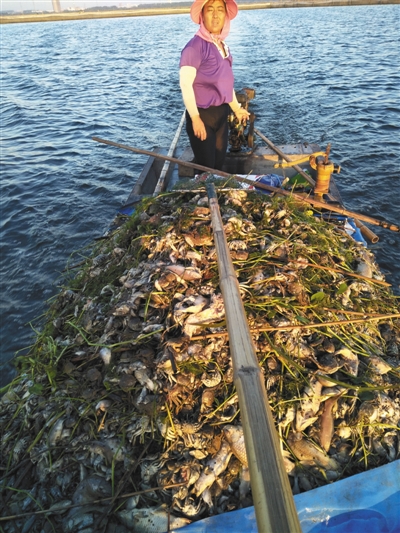 8月27日,漁民在湖里打撈死魚蟹。湖水呈黑色。