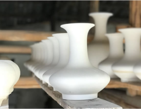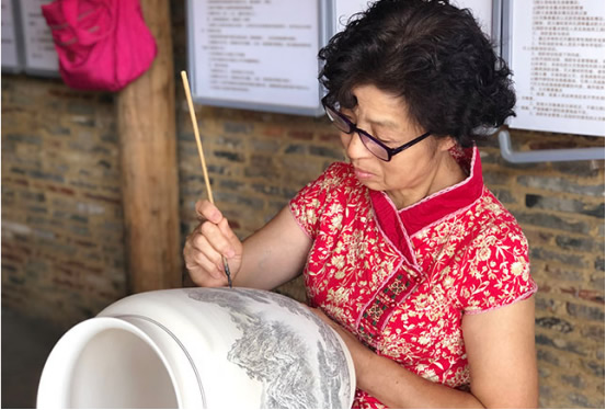 省級(jí)非物質(zhì)文化遺產(chǎn)傳承人袁寧霞在陶瓷坯體上描繪紋飾