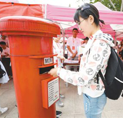 山東師范大學(xué)文學(xué)院新生將寫(xiě)給自己的卡片寄到郵筒里,四年后,在他們畢業(yè)時(shí)將收到這張卡片留作紀(jì)念。人民視覺(jué)