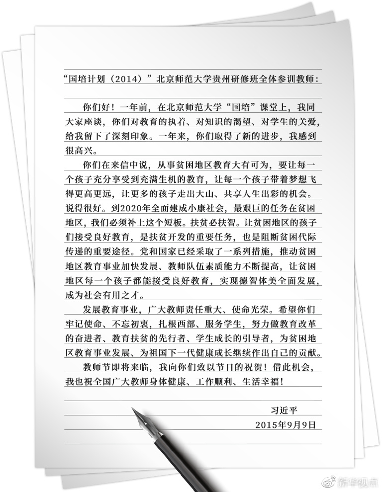 致信、考察、座談……一字一句、一言一行,浸潤著習(xí)近平總書記對默默奮戰(zhàn)在三尺講臺上的教師們的敬重之情、對昔日教導(dǎo)過自己的老師們的感恩之情、對有志于加入教師隊伍的優(yōu)秀青年們的勉勵之情、對扎根邊遠(yuǎn)貧困地區(qū)的教師們的希冀之情。