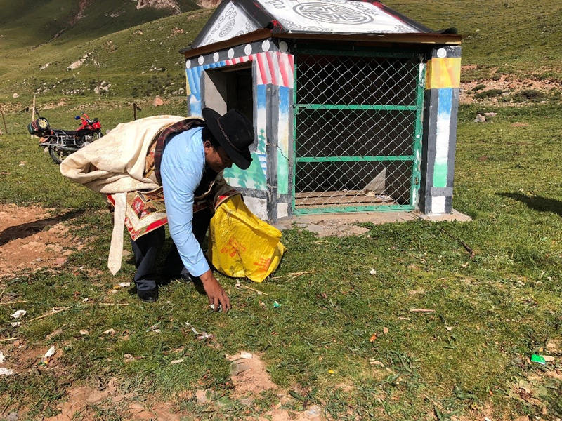 每天早晨9時,雜多縣扎青鄉(xiāng)牧民扎次尼瑪把自家牦牛趕出牛圈來到草場后,就開始了一天巡山的工作。除了對管護區(qū)內(nèi)草原基礎(chǔ)設(shè)施進行監(jiān)管、舉報盜采盜獵行為、監(jiān)測草原火情災(zāi)情以外,“分揀垃圾”也是扎次尼瑪作為“生態(tài)管護員”的工作日常。