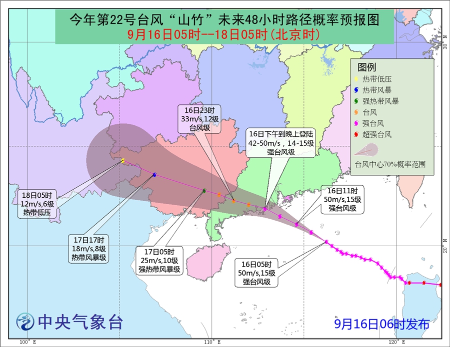 今年第22號臺風(fēng)“山竹”(強臺風(fēng)級)將以每小時30公里左右的速度向西偏北方向移動,將于16日下午到晚上在廣東珠海到吳川一帶沿海登陸(14~15級,42~50米/秒,強臺風(fēng)級),登陸后將繼續(xù)向西偏北方向移動,強度逐漸減弱。中央氣象臺9月16日06時繼續(xù)發(fā)布臺風(fēng)紅色預(yù)警。預(yù)計16日08時至17日08時,南海中北部、臺灣海峽、巴士海峽、瓊州海峽、北部灣、福建沿海、廣東沿海及廣東中南部、珠江口、香港、澳門、海南島東部和北部沿海、廣西東部及沿海將有7~10級大風(fēng),陣風(fēng)11~12級;其中南海北部、廣東大部沿海、珠江口、香港、澳門將有11~13級大風(fēng),陣風(fēng)14~15級,“山竹”中心經(jīng)過的附近海面或地區(qū)風(fēng)力可達(dá)14~15級,陣風(fēng)16~17級。