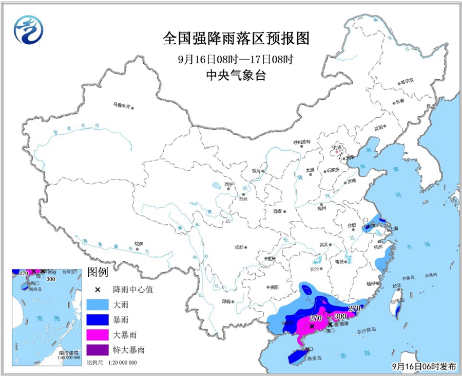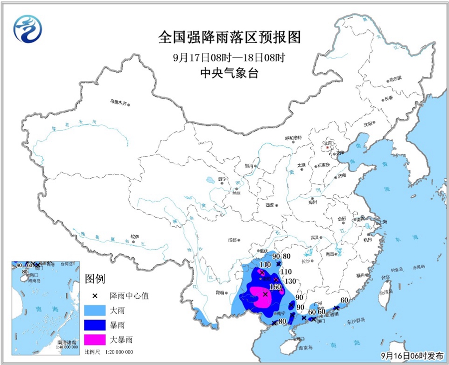受臺風(fēng)“山竹”影響,預(yù)計9月16日至18日,華南大部、貴州、云南東部和南部等地將有大到暴雨,其中廣東中南部、香港、澳門、廣西西部和中南部、海南島北部、貴州中南部、云南東南部和西南部等地的部分地區(qū)有大暴雨,局地有特大暴雨,上述地區(qū)過程降水量100~200毫米,局地可達(dá)250~400毫米,最大小時雨強可達(dá)40~60毫米,局地可超過80毫米。中央氣象臺9月16日06時繼續(xù)發(fā)布暴雨橙色預(yù)警。