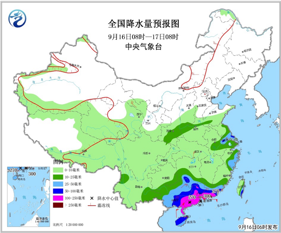 圖2 全國降水量預(yù)報圖(9月16日08時-17日08時)