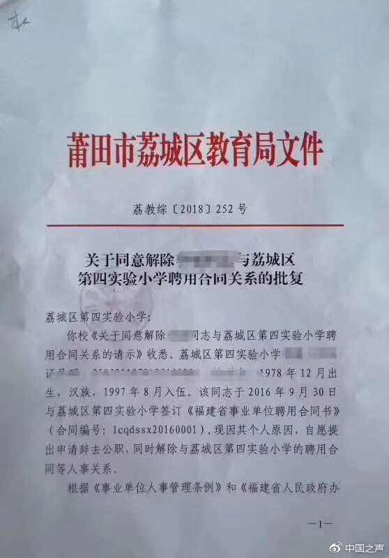網(wǎng)上還流傳著一份落款為荔城區(qū)教育局9月19日的紅頭文件,該文件是發(fā)給荔城區(qū)第四實(shí)驗(yàn)小學(xué)的,主要內(nèi)容是因老師個(gè)人原因,自愿提出申請(qǐng)辭去公職,教育局批復(fù)同意解除這名教師和學(xué)校的人事關(guān)系。有家長(zhǎng)因此將此文件和微信截圖聯(lián)系在一起,在朋友圈表示,微信截圖中的“廖老師”已經(jīng)被解職。