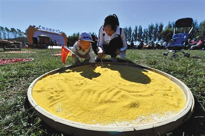 房山秋收節(jié)現(xiàn)場(chǎng),一游客在教孩子認(rèn)識(shí)谷物。李云鵬 攝