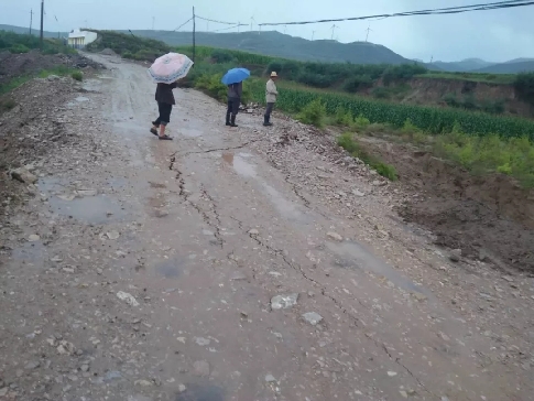 村民查看路況。山洪被堵在路的一側,路面已經下沉。