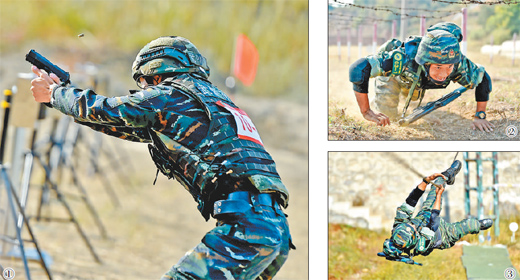 圖①:9月25日,在極限運(yùn)動(dòng)搜索射擊課目中,參賽隊(duì)員在進(jìn)行手槍射擊。 圖②:9月26日,參賽隊(duì)員在比賽中穿越障礙物。圖③:9月26日,在個(gè)人全能課目中,參賽隊(duì)員利用鐵索進(jìn)行橫渡。曹 峰攝(人民視覺)