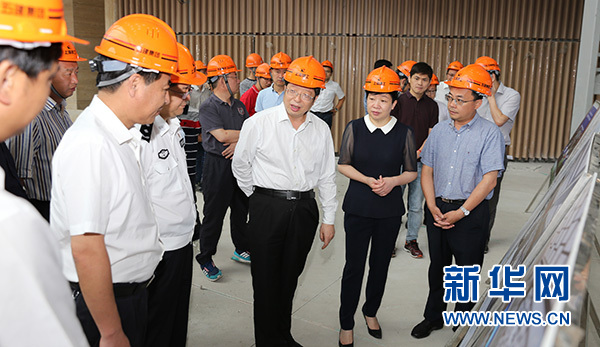 浙江省湖州市委副書記、市長錢三雄(前右三)檢查位于德清縣的首屆聯(lián)合國世界地理信息大會(huì)項(xiàng)目建設(shè)(2018年6月10日攝)。新華社發(fā)