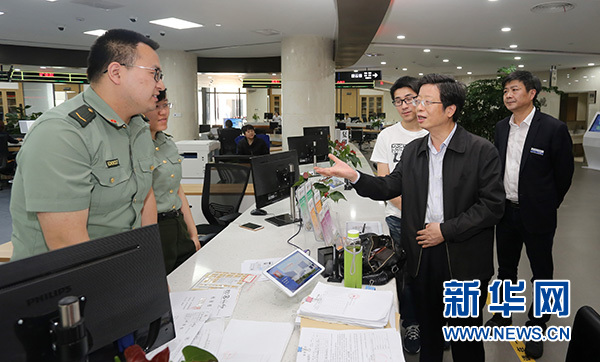 浙江省湖州市委副書記、市長錢三雄(右二)在湖州市民服務(wù)中心調(diào)研指導(dǎo)“最多跑一次”改革工作(2017年5月10日攝)。新華社發(fā)