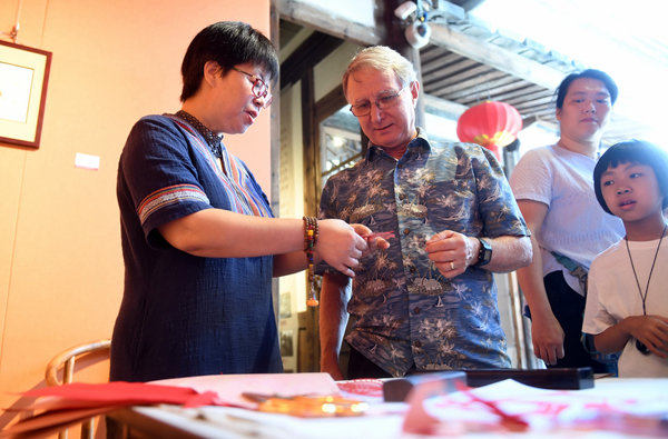 10月3日,在福建福州三坊七巷舉行的非遺剪紙展上,福州楊橋中學(xué)英語(yǔ)老師潘力鷹(左)在向美國(guó)客人講解中國(guó)的民間剪紙藝術(shù)。當(dāng)日是國(guó)慶假期的第三天。新華社記者 林善傳攝