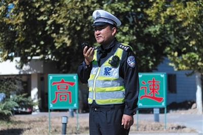 10月3日,北京八達嶺百葛服務(wù)區(qū)附近,昌平支隊高速路大隊機動警區(qū)警長王建立正在值勤。