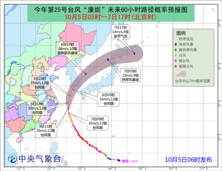 受“康妮”和冷空氣的共同影響,我國(guó)東部海域?qū)⒂休^大風(fēng)雨,其中5日08時(shí)到6日08時(shí),黃海南部、東海、臺(tái)灣東北洋面、浙江東部及沿海、上海沿海、江蘇沿海、杭州灣、長(zhǎng)江口區(qū)將有7-10級(jí)大風(fēng),其中東海大部、黃海東南部的風(fēng)力可達(dá)11級(jí),“康妮”中心經(jīng)過的東海東北部部分海域風(fēng)力可達(dá)12級(jí),陣風(fēng)13-14級(jí),浙江東北部、上海東部局地有中到大雨。為此,中央氣象臺(tái)10月5日06時(shí)繼續(xù)發(fā)布臺(tái)風(fēng)藍(lán)色預(yù)警。