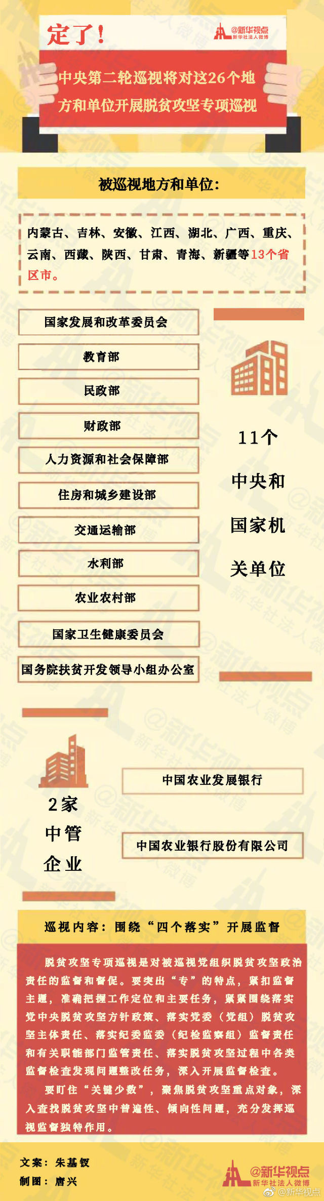 新華社北京10月9日電 經(jīng)黨中央批準(zhǔn),十九屆中央第二輪巡視將對(duì)內(nèi)蒙古、吉林、安徽、江西、湖北、廣西、重慶、云南、西藏、陜西、甘肅、青海、新疆、國(guó)家發(fā)展和改革委員會(huì)、教育部、民政部、財(cái)政部、人力資源和社會(huì)保障部、住房和城鄉(xiāng)建設(shè)部、交通運(yùn)輸部、水利部、農(nóng)業(yè)農(nóng)村部、國(guó)家衛(wèi)生健康委員會(huì)、國(guó)務(wù)院扶貧開(kāi)發(fā)領(lǐng)導(dǎo)小組辦公室、中國(guó)農(nóng)業(yè)發(fā)展銀行、中國(guó)農(nóng)業(yè)銀行股份有限公司等26個(gè)地方、單位黨組織開(kāi)展脫貧攻堅(jiān)專項(xiàng)巡視。