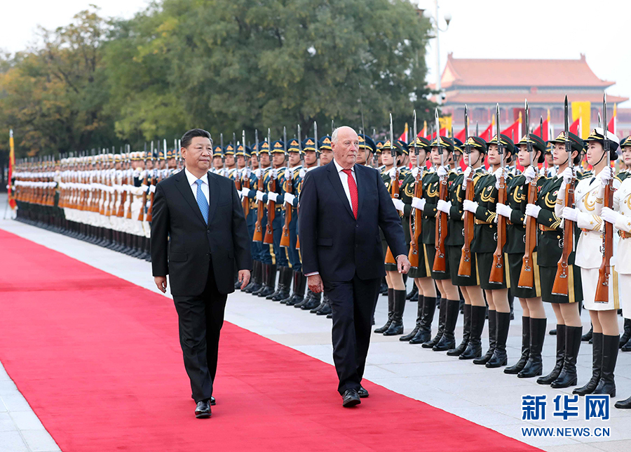10月16日,國家主席習(xí)近平在北京人民大會堂同挪威國王哈拉爾五世舉行會談。這是會談前,習(xí)近平在人民大會堂東門外廣場為哈拉爾五世舉行歡迎儀式。 新華社記者 劉衛(wèi)兵 攝