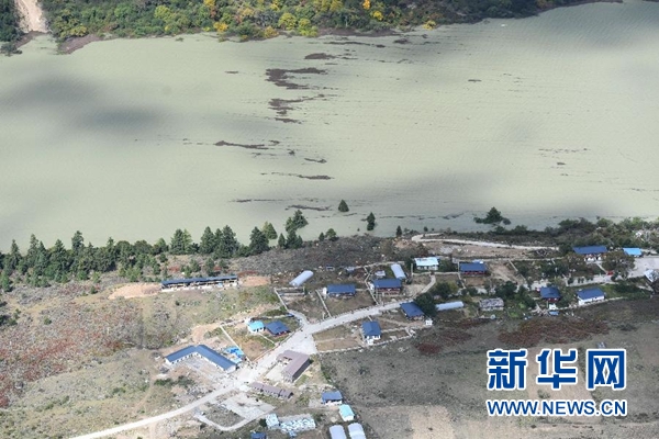 空中俯瞰堰塞湖和堰塞體(10月18日攝)。新華社記者 普布扎西攝