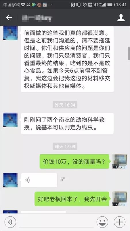為此,“喜來(lái)稀肉”微信公眾號(hào)8月2日發(fā)文稱,那不是寄生蟲,而是豬血管。并稱公司已經(jīng)和上述微信公眾號(hào)溝通,接洽的“徐先生”提出要10萬(wàn)元封口費(fèi),下午六點(diǎn)前到賬,否則將再次發(fā)送推文。事后查明,“喜來(lái)稀肉”豬肉沒問題,而公司也向“上海好白相”提出8萬(wàn)元的索賠。?
