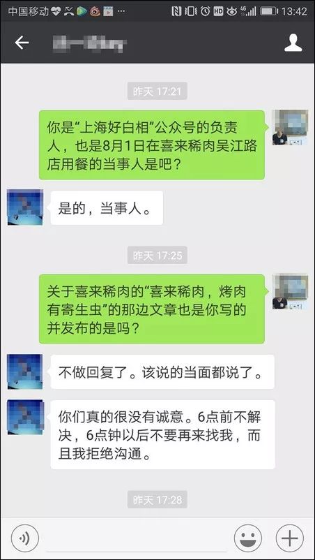 除了房企,餐飲企業(yè)也容易被勒索,因?yàn)槭称钒踩珕栴}很容易吸引眼球。例如,上海有很多吃喝玩樂的號(hào),個(gè)別自媒體號(hào)也喜歡通過(guò)寫負(fù)面新聞來(lái)收“封口費(fèi)”,因?yàn)檫@樣比正面推廣來(lái)錢快多了。但這一套路在2017年大白于天下——去年8月1日,“上海好白相”微信公眾號(hào)發(fā)文,有網(wǎng)友稱其和朋友在上海吳江路的“喜來(lái)稀肉”聚餐,在烤肉里吃出了疑似寄生蟲的東西。