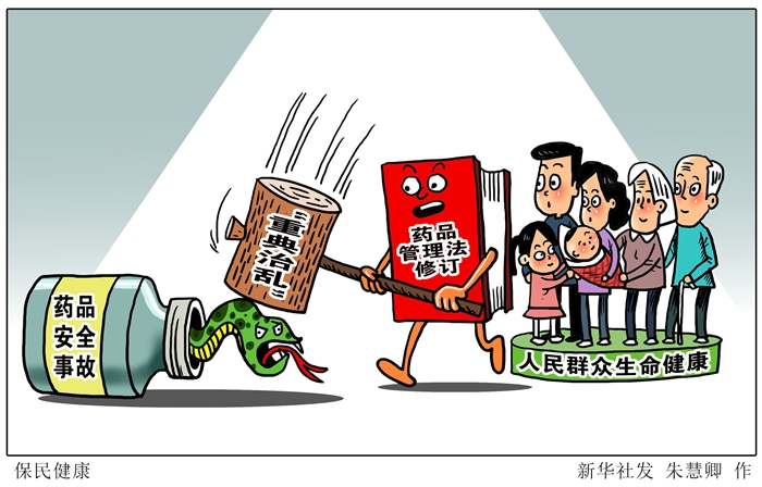 漫畫:保民健康 藥品管理法修正草案10月22日提請(qǐng)全國(guó)人大常委會(huì)審議,法律的修改為守住藥品安全底線、維護(hù)人民群眾生命健康,開出了去疴的“猛藥良方”。 新華社發(fā) 朱慧卿 作