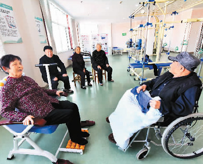 圖為山東省青州市,老人在醫(yī)養(yǎng)院里做康復(fù)訓(xùn)練。王繼林 攝(人民視覺)
