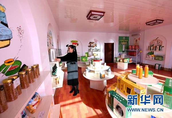 在山西省右玉縣殺虎口村,村民王彩霞在殺虎口村生態(tài)旅游專業(yè)合作社內(nèi)整理當?shù)靥禺a(chǎn)(10月25日攝)。新華社記者 楊晨光攝