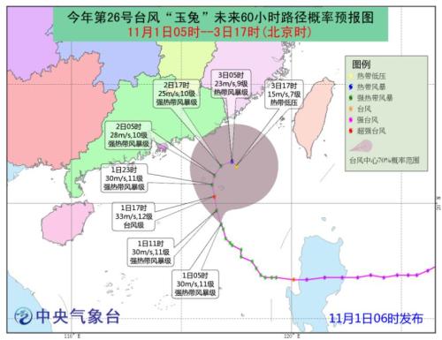 今年第26號(hào)臺(tái)風(fēng)“玉兔”(強(qiáng)熱帶風(fēng)暴級(jí))的中心今天(1日)早晨5點(diǎn)鐘位于東沙島偏南方向約170公里的南海東北部海面上,中心附近最大風(fēng)力11級(jí)(30米/秒),中心最低氣壓980百帕。