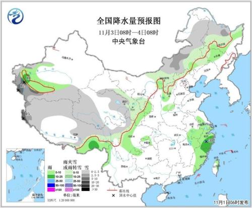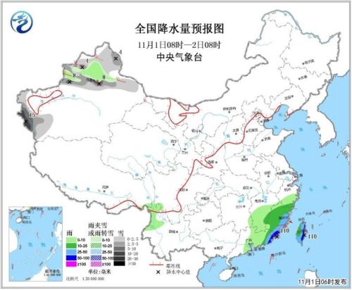 11月1日08時(shí)至2日08時(shí),新疆北部和南疆西部山區(qū)等地部分地區(qū)有中到大雪或雨夾雪,局地有暴雪(10~15毫米)。江南東部、廣東中東部和臺(tái)灣島東北部等地的部分地區(qū)有中到大雨,其中,廣東東部、福建南部和臺(tái)灣等地局地有暴雨或大暴雨(100~110毫米)。新疆北部、南疆盆地、內(nèi)蒙古西部和甘肅西部等地的部分地區(qū)有5~6級(jí)及以上風(fēng)。臺(tái)灣海峽、南海東北部海域?qū)⒂?~9級(jí)大風(fēng),陣風(fēng)10~11級(jí)(見圖3)。