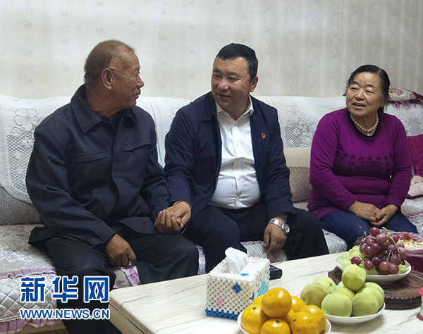吾布力喀斯木(中)看望結(jié)親對象、老黨員周福年一家(10月17日攝)。新華社記者 孫少雄 攝