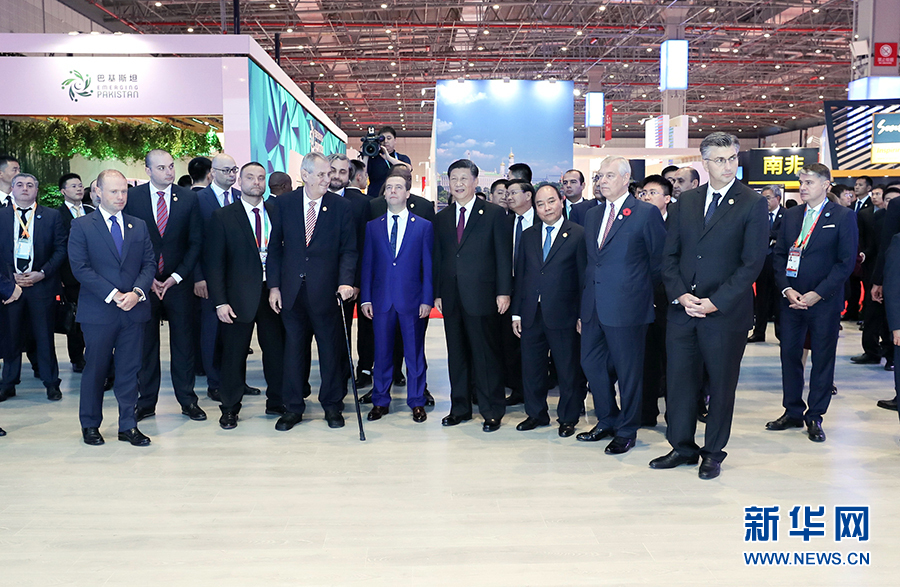 中午,習(xí)近平同外國領(lǐng)導(dǎo)人一同步入國家貿(mào)易投資綜合展展廳。他們邊走邊看,邊看邊談,先后參觀了匈牙利、埃及、英國、捷克、肯尼亞、薩爾瓦多、多米尼加、老撾、格魯吉亞、越南、巴基斯坦、俄羅斯等國展區(qū),了解各國經(jīng)貿(mào)發(fā)展成就和特色優(yōu)勢產(chǎn)品。習(xí)近平和各國領(lǐng)導(dǎo)人通過視頻欣賞了匈牙利的美麗風(fēng)光、領(lǐng)略了埃及的悠久文明和現(xiàn)代發(fā)展規(guī)劃,共同體驗了英國館炫酷時尚的裸眼3D視頻。在捷克館,澤曼總統(tǒng)用捷克產(chǎn)鋼琴即興演奏一曲,并邀請習(xí)近平品嘗捷克啤酒??夏醽喌孽r花、薩爾瓦多的咖啡、多米尼加的水果,琳瑯滿目的各國特色產(chǎn)品吸引中外領(lǐng)導(dǎo)人頻頻駐足。格魯吉亞總理和越南總理親自向習(xí)近平推介本國農(nóng)產(chǎn)品和旅游項目。老撾館的中老鐵路項目沙盤和巴基斯坦館的中巴經(jīng)濟走廊展板分別展現(xiàn)了中老、中巴共建“一帶一路”、實現(xiàn)共同發(fā)展的美好愿景。在俄羅斯館,習(xí)近平在梅德韋杰夫總理陪同下聽取中俄在核電、天然氣、飛機制造、地方交往等領(lǐng)域合作成就介紹,共同展望中俄合作的廣闊前景。