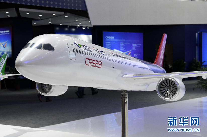 ??? 現場展示的CR929模型(11月7日攝)。 在第十二屆中國國際航空航天博覽會上,作為我國民用大飛機的研制主體,中國商用飛機有限責任公司展示了CR929遠程寬體客機1:1樣機,吸引了眾多觀眾參觀體驗。 新華社記者 梁旭 攝
