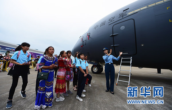 藍(lán)天春蕾女童在航展現(xiàn)場參觀(11月10日攝)。 新華社發(fā)(陳藝 攝)