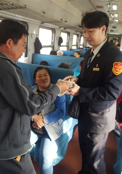 目前,除了四個大站提供售票服務外,7053次經過的其他20個小站都是上車補票。圖為列車員正在為乘客補票。
