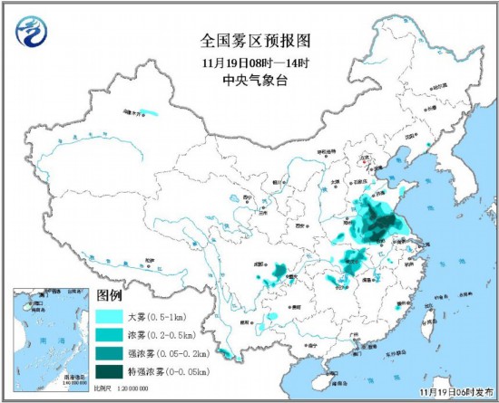 預計,11月19日早晨至上午,山東西部、河南中東部、安徽中北部、江蘇中北部、湖北中東部、四川盆地中部等地有大霧,其中山東西南部、安徽北部、江蘇北部等地的部分地區(qū)有能見度不足50米的特強濃霧。