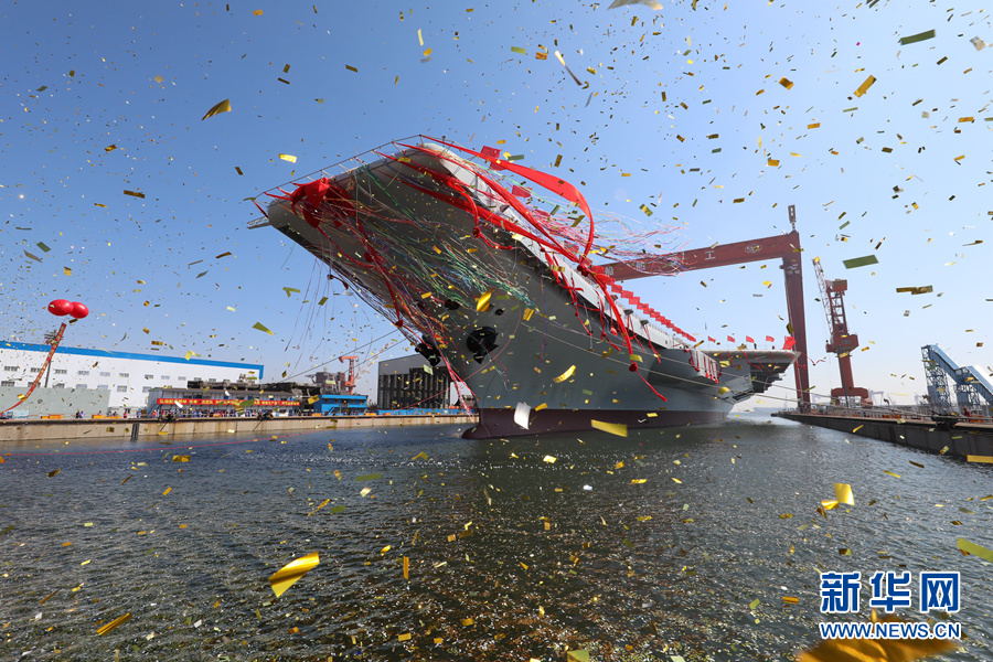 我國第二艘航空母艦下水儀式在中國船舶重工集團(tuán)公司大連造船廠舉行(2017年4月26日攝)。 新華社記者 李剛 攝