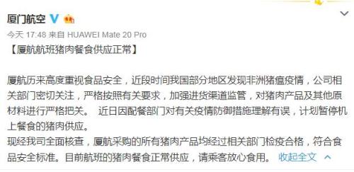 廈門航空24日在官方微博發(fā)布消息稱,廈航航班豬肉餐食供應(yīng)正常,其采購的所有豬肉產(chǎn)品均經(jīng)過相關(guān)部門檢疫合格,符合食品安全標準。