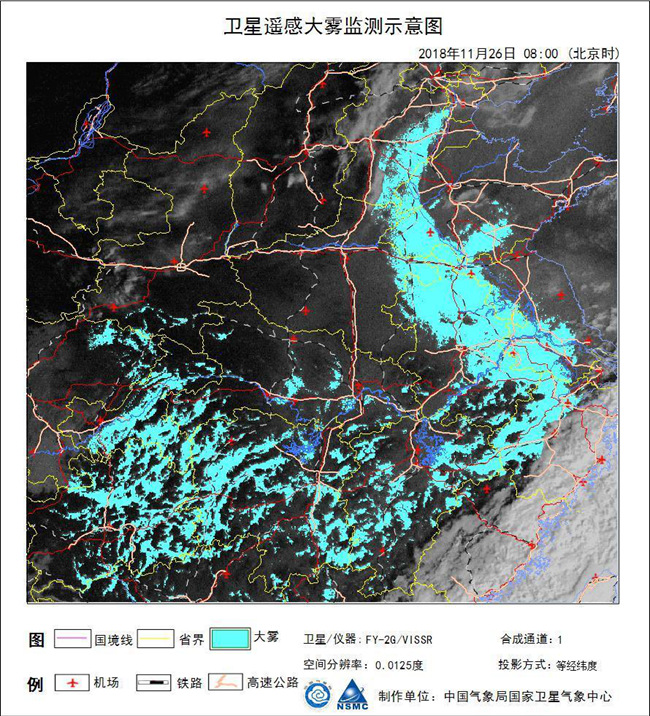 圖為FY-2G氣象衛(wèi)星大霧監(jiān)測示意圖像 2018年11月26日08:00(北京時(shí))