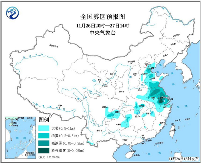 預(yù)計(jì)未來一周(11月26日至12月2日),受靜穩(wěn)天氣影響,江蘇、安徽、上海、浙江北部等地的大霧天氣將持續(xù),由于晚上至早晨溫度較低,是霧的多發(fā)時(shí)段,因此主要影響時(shí)段在夜間至次日上午。另外,河南東部、山東南部、湖北中東部、四川盆地以及江南北部的部分地區(qū)也多大霧天氣。
