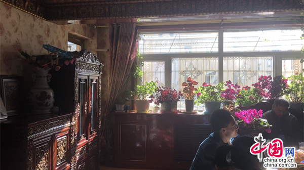 尕瑪文索的新家在統(tǒng)建區(qū)的一棟居民樓內(nèi),房間里擺滿了藏族特色的家具和裝飾品,各種花朵盆栽占據(jù)了整個陽臺?!靶路孔拥亩旌拖奶煲粯优?,花可以繼續(xù)長,什么植物都可以養(yǎng)。”“暖和”成了尕瑪文索對新房子最大的印象。