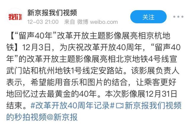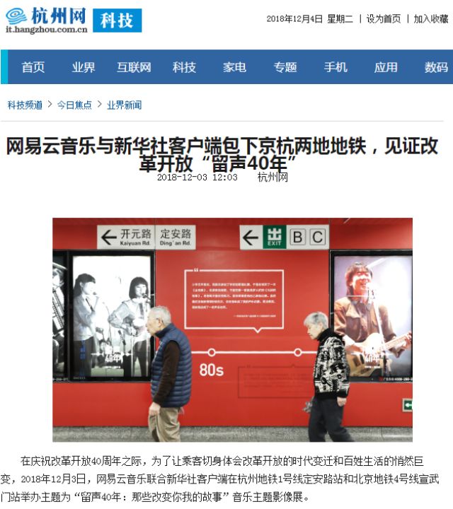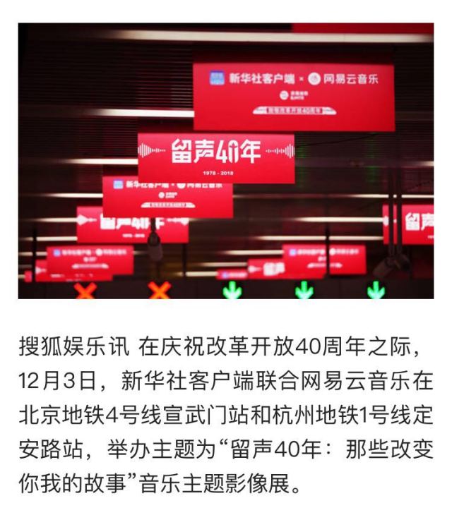 新華社北京12月4日電(記者 牧小湘)為慶祝改革開放40周年,新華社客戶端與網(wǎng)易云音樂、京港地鐵聯(lián)合舉辦的“留聲40年:那些改變你我的故事”音樂主題影像展12月3日亮相北京地鐵4號線宣武門站及杭州地鐵1號線定安路站。