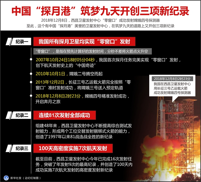 2018年12月8日,西昌衛(wèi)星發(fā)射中心“零窗口”成功發(fā)射嫦娥四號(hào)探測(cè)器。至此,這個(gè)有中國(guó)“探月港”美譽(yù)的衛(wèi)星發(fā)射中心,在筑夢(mèng)九天的道路上又開(kāi)創(chuàng)三項(xiàng)新紀(jì)錄。