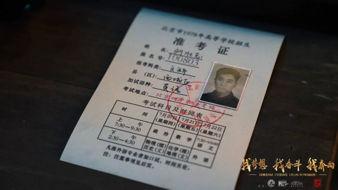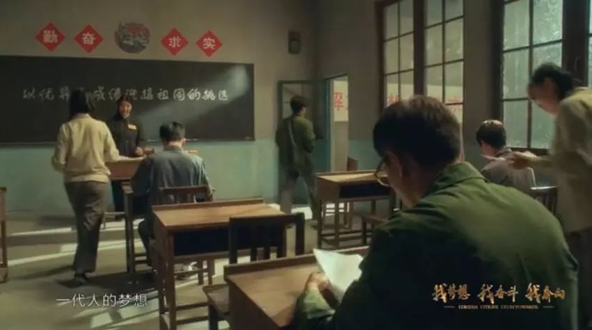 1978年高考恢復,中國由此重新迎來了尊重知識、尊重人才的春天。坐在1978年正在進行高考的教室里,考生劉燁寫下自己作文的最后一句話:“為祖國和人民不懈奮斗”。他在鏡頭前書寫下“奮斗”二字,體現(xiàn)了那個年代的人渴望建設祖國的一腔熱血。