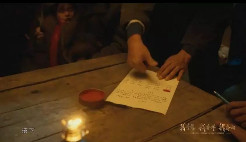 小崗村的變革,有多少人是通過那幅油畫了解到當時的場景的,這一次我們讓油畫“動了”起來。在畫面中,所有演員的站位,包括后來進來的劉燁,都精準地參照并還原了小崗村油畫的畫面。變身農(nóng)民的劉燁提著馬燈偷偷進入屋內(nèi),詢問過后,率先在責任書上按下手印,畫面中的責任書是以博物館中保存的原版責任書為參考,完全臨摹后制作的道具,整個道具細致到了每一位農(nóng)民按手印的位置。