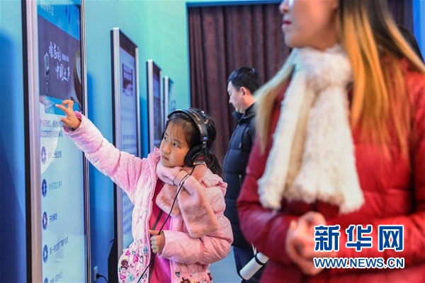 一名小觀眾在展覽上體驗(yàn)互動(dòng)屏幕。