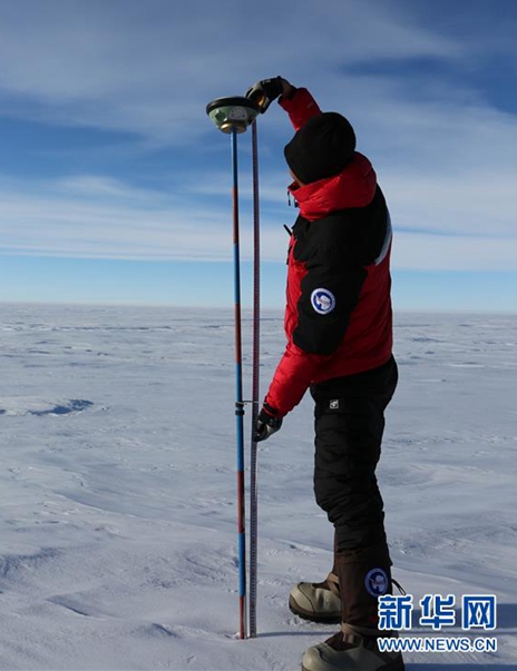 中國第35次南極科考隊隊員、武漢大學中國南極測繪研究中心的楊元德在測量冰流速(12月22日攝)。新華社記者 劉詩平 攝
