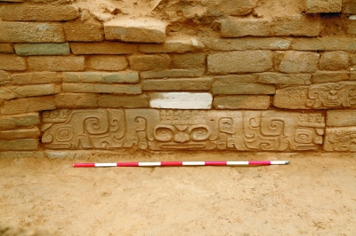 皇城臺為一處四圍包砌石砌護墻的高阜臺地,位于內(nèi)城中部偏西。皇城臺臺頂?shù)囊恍┐笮徒ㄖ湓谝惶幋笮团_基上。2018年,從這處大臺基南護墻倒塌的墻體石塊內(nèi),考古隊出土了30余件石雕作品,有一些石雕還鑲嵌在南護墻墻面上。這些石雕絕大多數(shù)是雕刻于石塊一面的單面雕刻,有符號、人面、神面、動物、神獸等,有一些畫面長度近3米,以中心正臉的神面為中心,兩側(cè)對稱雕出動物和側(cè)臉人面,體現(xiàn)出成熟的藝術(shù)構(gòu)思和精湛的雕刻技藝。