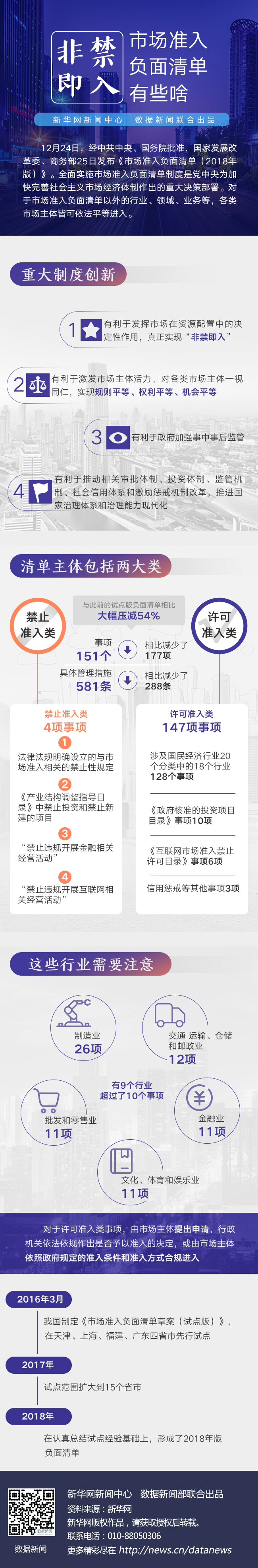 隨著《市場準(zhǔn)入負(fù)面清單(2018年版)》25日正式公布,我國市場準(zhǔn)入負(fù)面清單制度進入全面實施新階段,實現(xiàn)清單之外所有市場主體“非禁即入”。